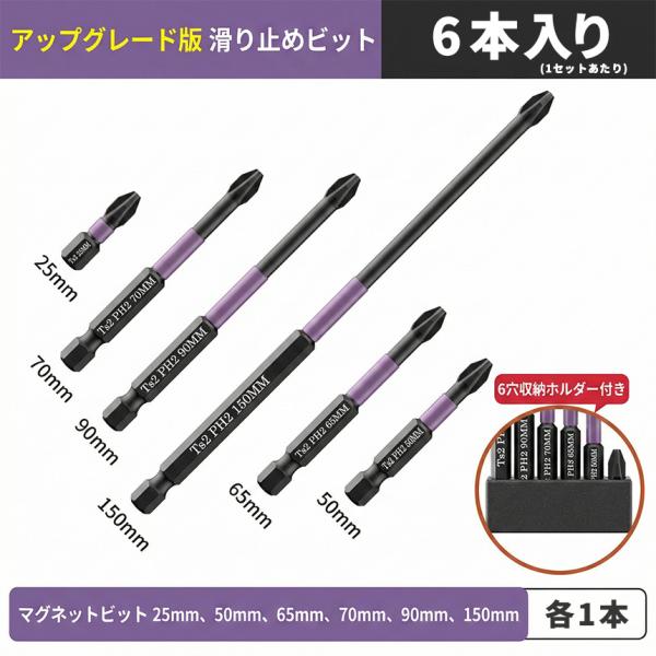 インパクトドライバー ビットセット 6本プロ仕様/S2合金鋼/硬度HRC60 なめない 折れない 驚異の同軸性 強力マグネット プラスビット 電動ドリル 6.35mm六角軸 DIY 整備 工具セット 25/50/65/70/90/150mm PH2