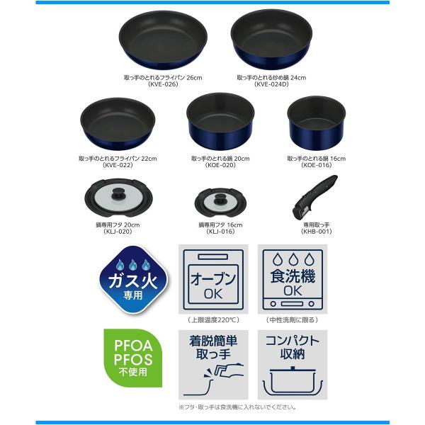 ●フライパン22cm、フライパン26cm、炒め鍋24cm、鍋16cm、鍋20cm、鍋専用フタ16cm、鍋専用ふた20cm、専用取っ手