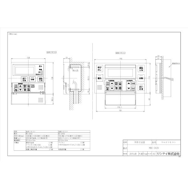 リンナイ 浴室・台所リモコンセット MBC-240V(A) おいだき用リモコンセット マルチセット Rinnai