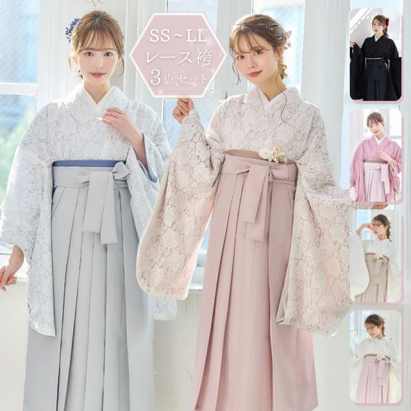 袴 4点セット 袴セット 卒業式 大学生 小学生 二尺袖 着物 和装 レディース レース ブルー ピンク ホワイト ライトグレー SS S M L LL 送料無料