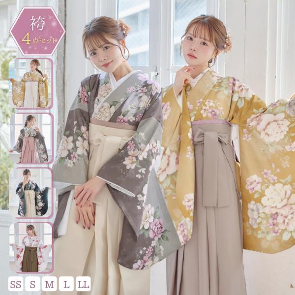 袴 4点セット 袴セット 小学生 大学生 ジュニア 女の子 百合 薔薇 花柄 卒業式 かわいい おしゃれ レトロ 華やか 二尺袖着物 SS S M L LL 送料無料 無地袴