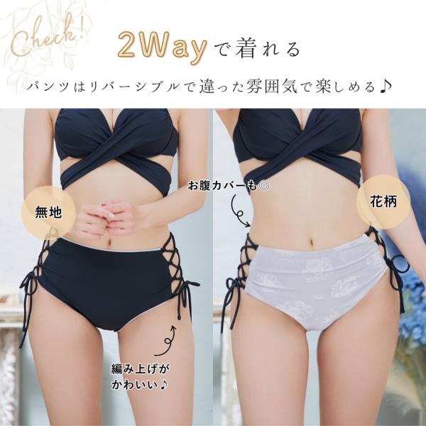ビキニ 水着 レディース 盛れる 2Way クロスワイヤー 花柄 編み上げ ホワイト ブラウン ブラック かわいい オシャレ 体型カバー 谷間メイク ワイヤー入り パッド
