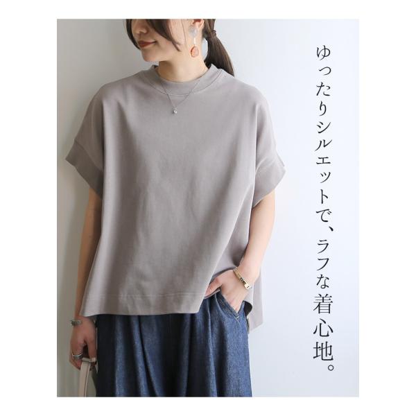 二の腕カバーもばっちり!日常使いしやすい、こなれ感のある半袖Tシャツ。