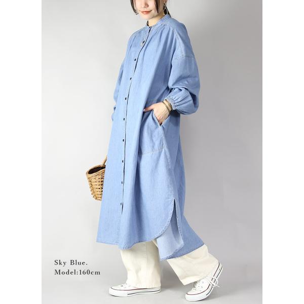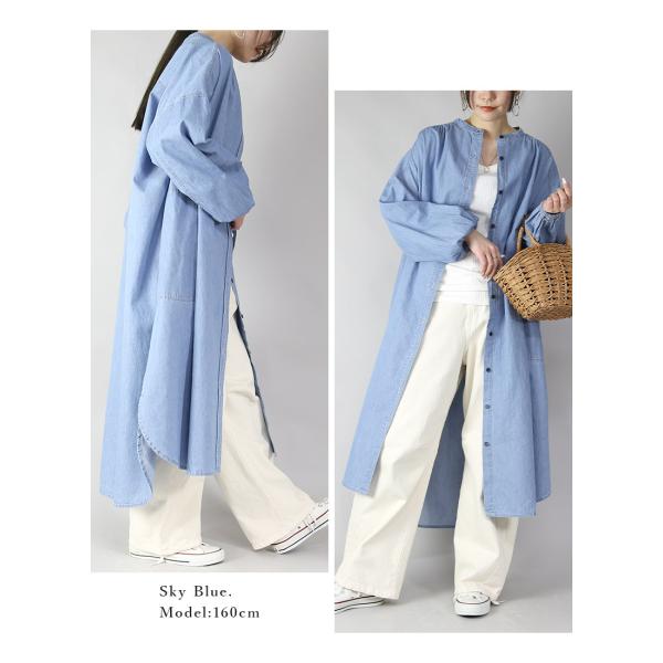 デニム シャツワンピース レディース ロング 長袖 羽織り ライトデニム コットン Aライン 春 夏 秋 ポケット 体型カバー スリット おしゃれ