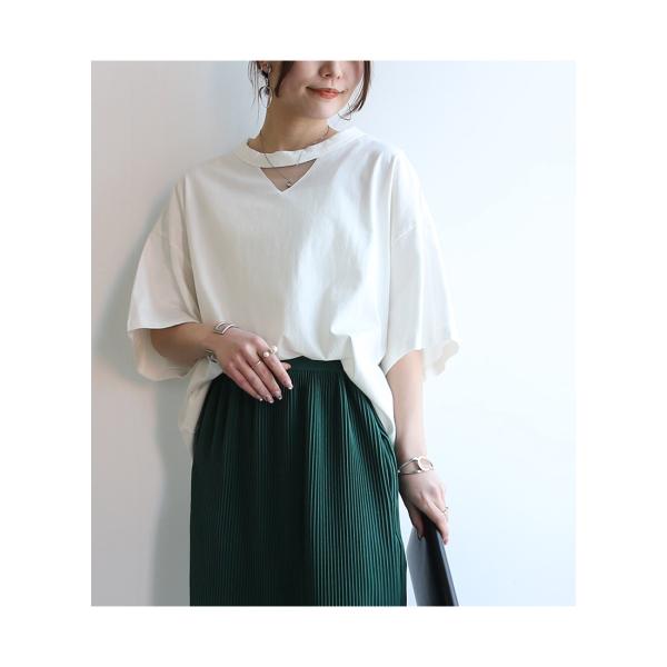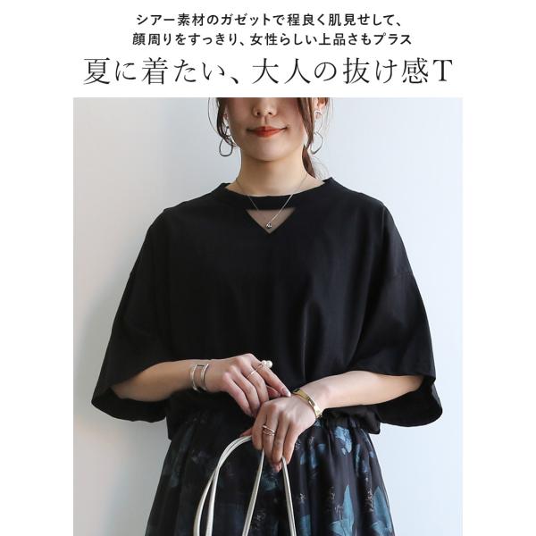 シンプルなのに一枚でこなれて見える大人のためのTシャツ。首元だけほんのり透けるシアーデザインで、さりげない抜け感を演出したデザインです。