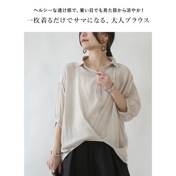 ブラウス レディース 五分袖 5分袖 黒 涼感 透け感 トップス 体型カバー 春 夏 カジュアル ゆったり 二の腕カバー 裾タック 涼しい おしゃれ