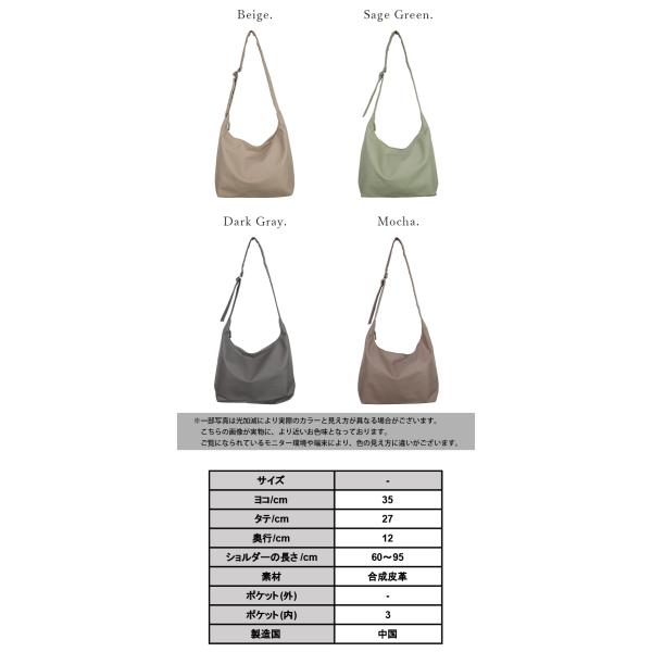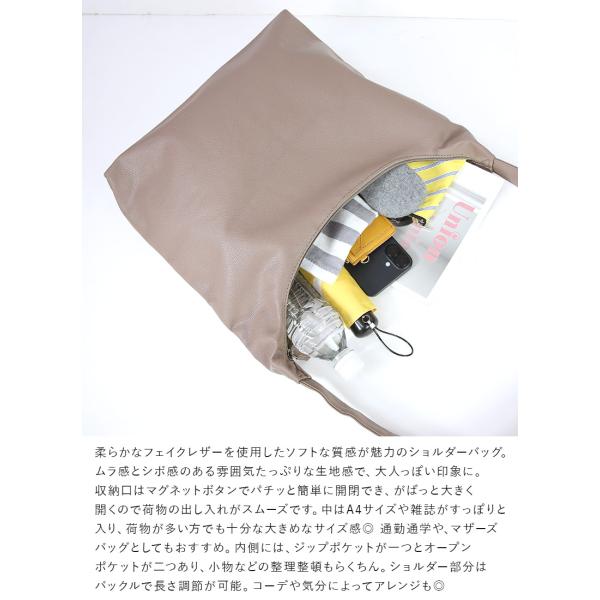 柔らかなフェイクレザーを使用したソフトな質感が魅力のショルダーバッグ。たっぷり入る容量で荷物が多い方でも安心です◎