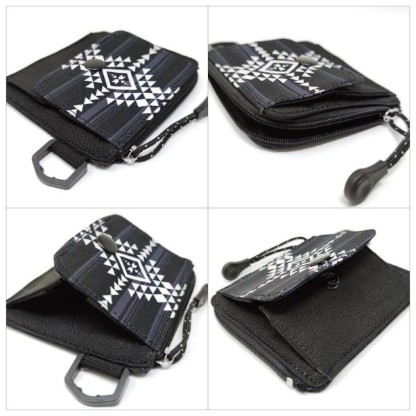 L字に大きく開くジップタイプのコンパクトウォレット。中面は大きく3つの仕切りに分かれており、折り畳んだお札やカードの収納が可能。ネイティブ柄がアクセントの小銭入れは一目で見やすく取り出しやすいボックス型。小銭を探す手間も軽減できます。コンパクトながらも十分な機能性を持ち、使い勝手もよいので普段使いから、旅行・アウトドアなど、シーンを選ばず活躍できるアイテムです。
