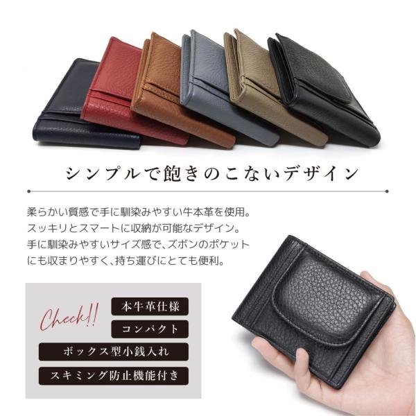 柔らかい質感で手に馴染みやすい牛本革を使用。スッキリとスマートに収納が可能なデザイン。手に馴染みやすいサイズ感で、ズボンのポケットにも収まりやすく、持ち運びにとても便利。コンパクトながらも使い勝手は抜群!オープン式の財布なので、お札は折らずに収納可能、出し入れもスムーズです。クリア窓カード入れはIDカードなどの収納に便利です。大きく開くボックス型コインケースは、一目で見やすく、取り出しやすい!小銭を探す手間も軽減できます。また、大切なカードの情報を盗まれないよう、外側全体にスキミング防止機能シートを搭載。非接触型のスキミングを防止します。無地のシンプルなタイプなので飽きずに長く使えます。