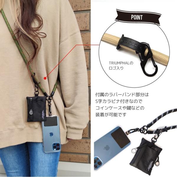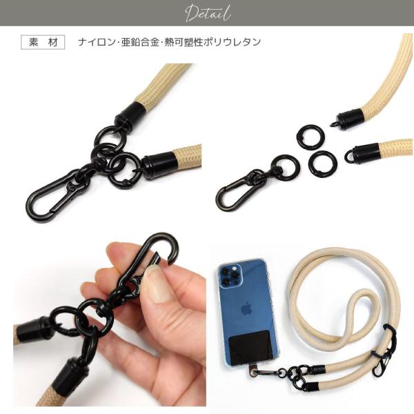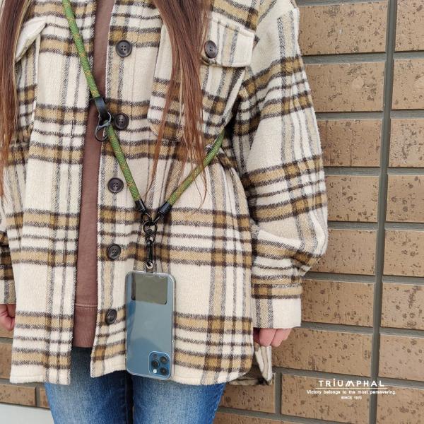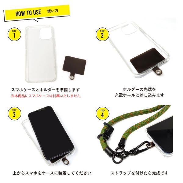 登山用ロープを使用したスマホショルダーストラップ。ホルダーを充電用ホールに差し込むだけで簡単に装着が可能。首や肩にかけられるので、紛失・落下防止に!付属のラバーバンドでサイズ調節もでき、男女問わずお使いいただけます。