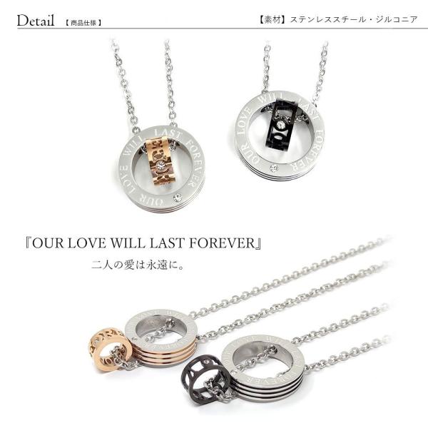 『OUR LOVE WILL LAST FOREVER (二人の愛は永遠に)』の刻印にワンポイントでジルコン、内側にも透かしのメッセージリングを施したネックレスです。