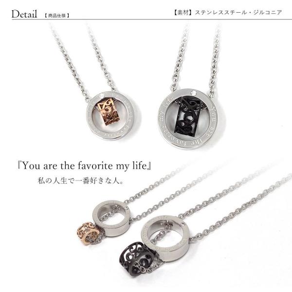 『You are the favorite my life (私の人生で一番好きな人)』の刻印にワンポイントでジルコン、内側にも透かしのメッセージリングを施したネックレスです。