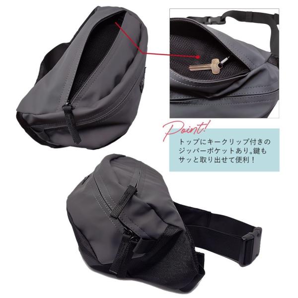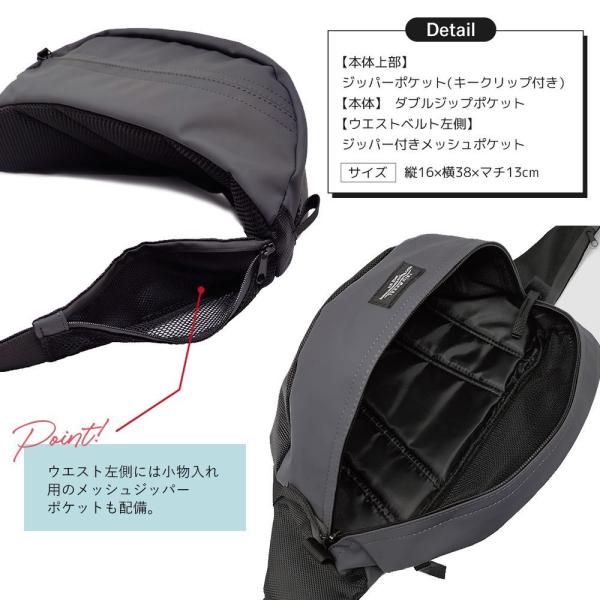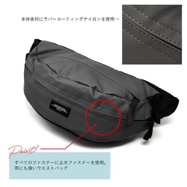 本体素材にラバーコーティングナイロンを使用し、全てのファスナーに止水ファスナーを使用した、雨に強い収納力抜群な軽量ウエストバッグ。底マチも広くとってあるので、500mlのペットボトルも入る大容量!本体上部にはジッパーポケットがあり、紛失しがちな鍵もつけられるキークリップ付き。ウエスト左側には小物入れ用のメッシュジッパーポケットも配備。ベルトはたすき掛けにも便利なワンハンドで長さ調節できる片引きタイプ。