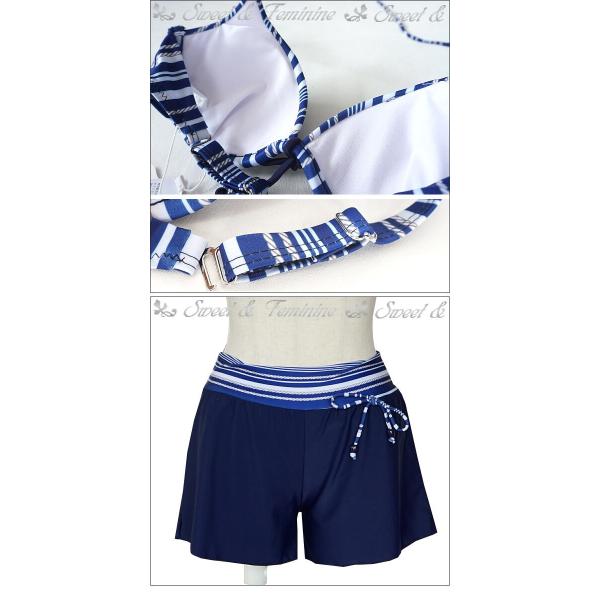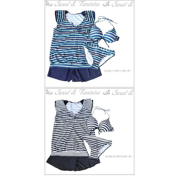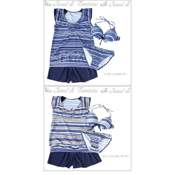 水着 体型カバー 4点セット水着 チュニック ショートパンツ ビキニ ホルダーネック 水着 レディース ボーダー ブルー ネイビー