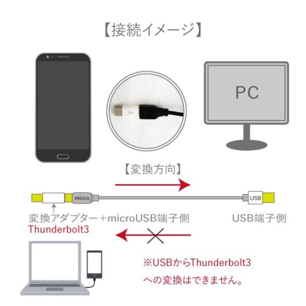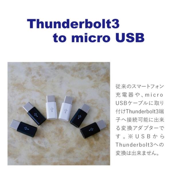 従来のスマートフォン充電器や、microUSBケーブルに取り付けThunderbolt3端子へ接続可能にできる変換アダプターです。