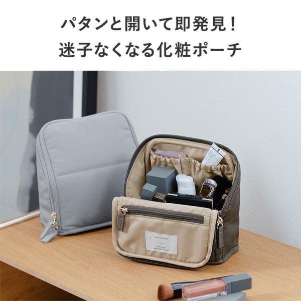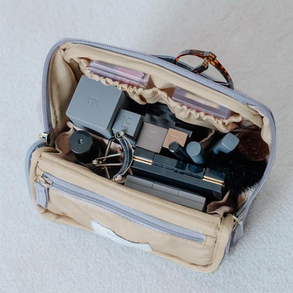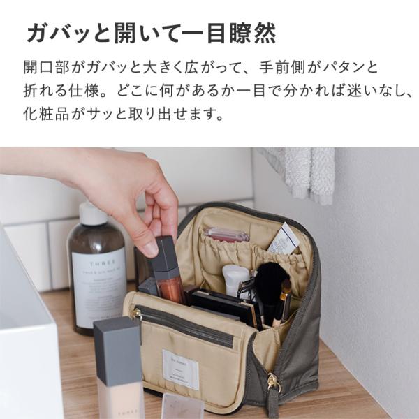 ガバッと開いて、手前にパタンと倒れる仕様でコスメが「見やすく、取り出しやすく、整頓しやすい」化粧ポーチ。迷子になりがちな細かな物もワンアクションで取り出せます。