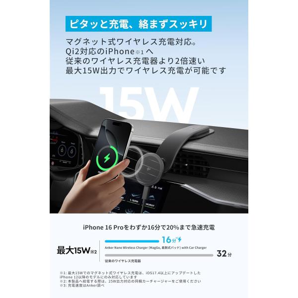 Anker Nano Wireless Charger (MagGo, 着脱式パッド) with Car Charger 最大15W出力でワイヤレス充電 360°回転 最大45°まで
