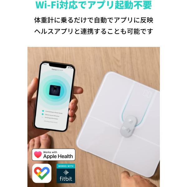 ・16の項目でカラダ全体を測定:体重やBMI、体脂肪率などの基本情報のみでなく、心拍数、筋肉量、骨量、体年齢、皮下脂肪率などのカラダに関する16の項目を測定できます。※本製品は体重の測定や体組成をモニターするためのもので、医療機器ではありません。本製品から提供される健康データおよび提案は、あくまで参考であり、診断や治療の根拠となるものではありません。