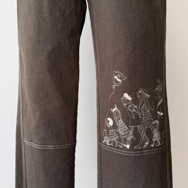 左足に様々な世代の刺繍入りストレッチデニムパンツ。
