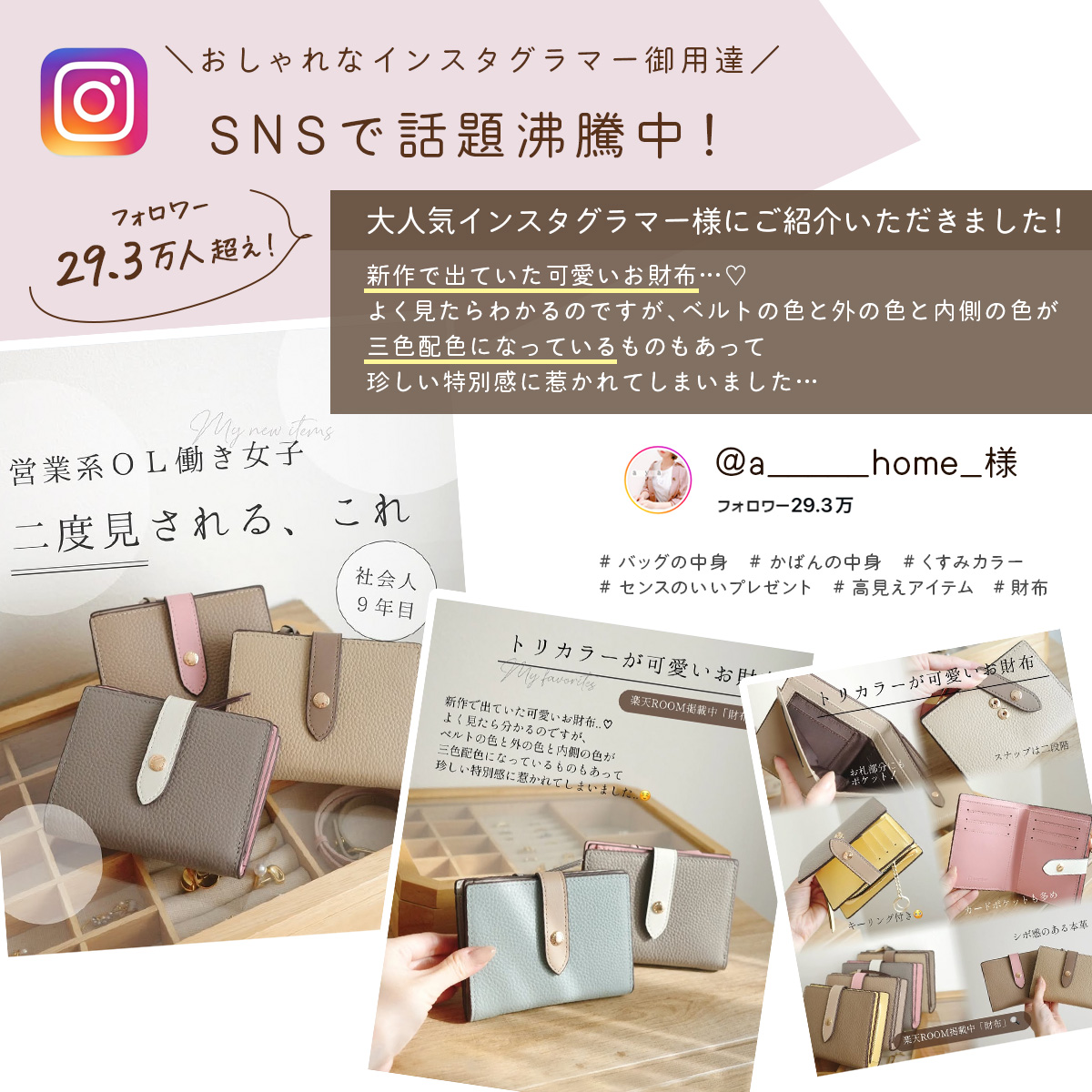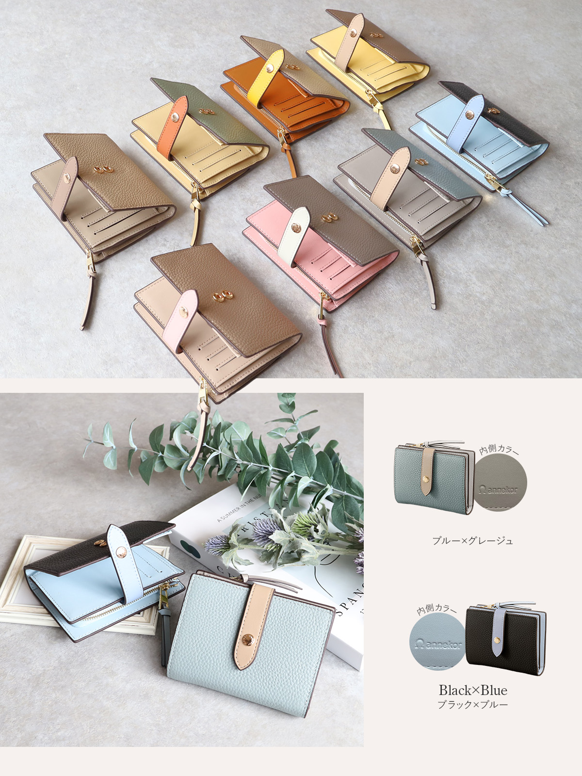 ミニサイズながら、カード類を最大12枚まで収納可能で札入れも仕切りがある本格仕様。バイカラーのフラップと内側色がおしゃれなアクセント。
