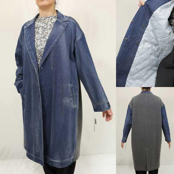 春夏SALE【アヤン/年間物/814303/30%OFF】綿ポリダンガリー前身頃裏キルト+背面綿ポリジャージー切替テーラードダブルチェスターコート/ayane/sps/1i12b751xx