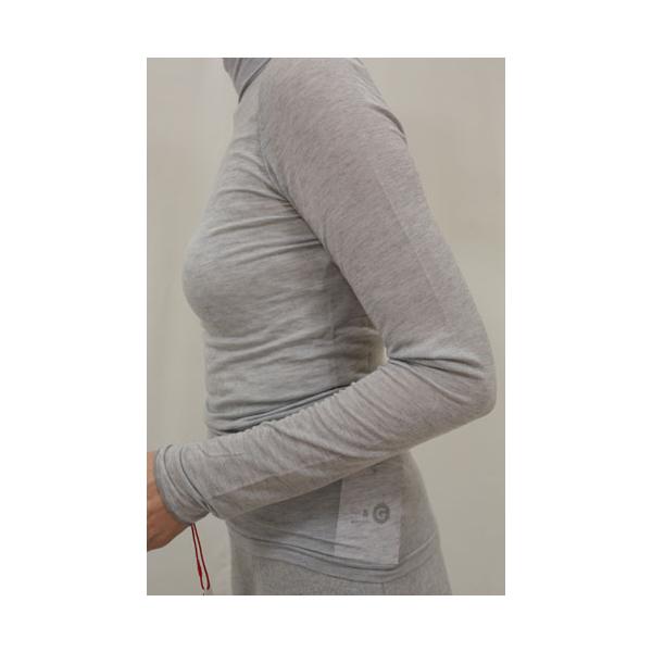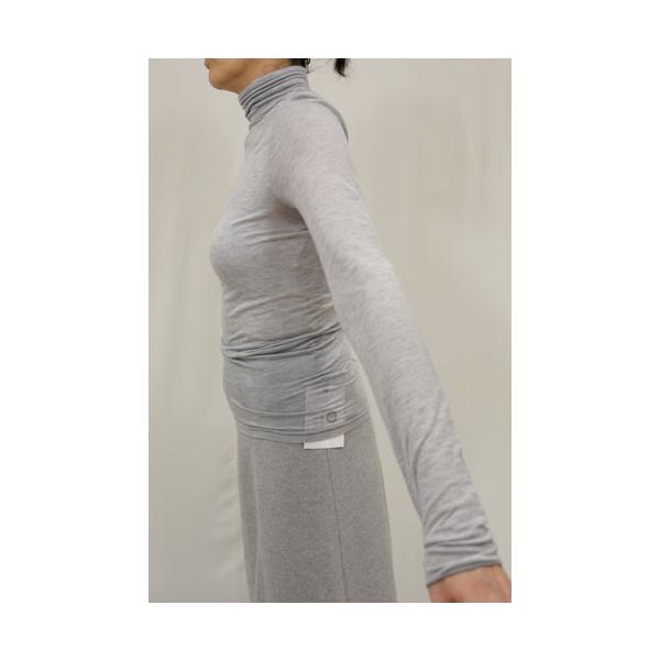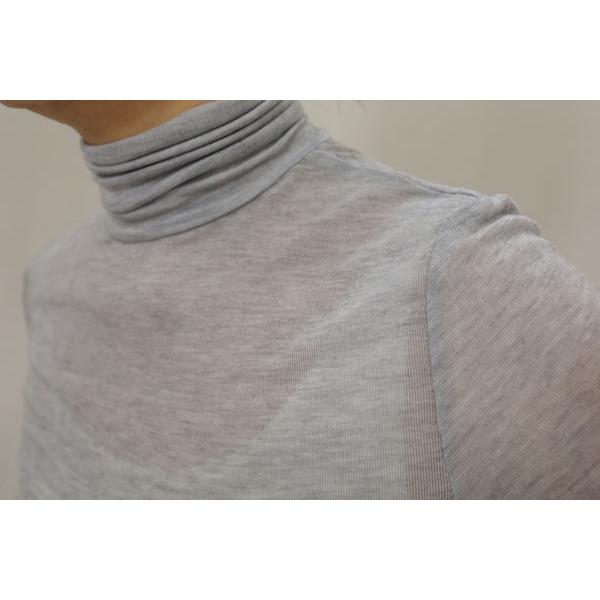 80243450/セルロース・シルク/絹・カシミアストレッチガーゼの無地素材、タートルネックカットソー、やや長めのヒップ丈でクシュクシュ超ロングスリーブです。2重使いのハイネックは程良いフィット感で首元が暖かく、折り返してタートルネックでも、そのままクシュクシュっとさせてもOKです。コンパクトなフィット感ですので、秋〜冬〜春3シーズンの長い期間に渡ってインナーで活躍する梅春物/年間物です。植物繊維・絹・カシミアの天然・再生素材ですので、肌触り抜群で仄かに暖かみがある着心地ですが、薄手で透け感がありますのでインナータンクトップ重ね着がお勧めです。メーカーリコメンド/カシミヤシルクソフトタートルネック。着用モデルコメント/フィット感のあるベーシックなカットソー、シルク・カシミヤ混の素材の良さがあり薄くて肌触りよく暖かみ感じます。どちらかというとインナー使いです。同素材の丸首/クルーネックは80243600。