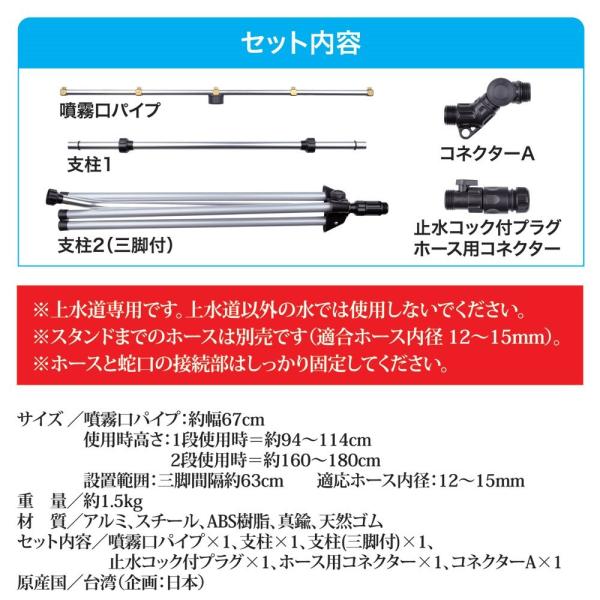 ■セット内容:噴霧口パイプ×1、支柱×1、支柱(三脚付)×1、止水コック付プラグ×1、ホース用コネクター×1、コネクターA×1