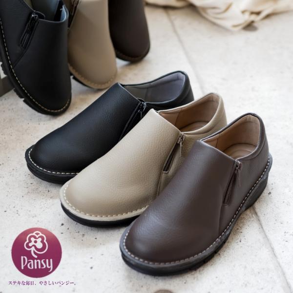pansy パンジー スリッポンシューズ 靴 レディース 軽量 サイドジップ サイドゴム ステッチ コバ フラット ラウンド 柔らかい 歩きやすい 履きやすい 旅行 3e