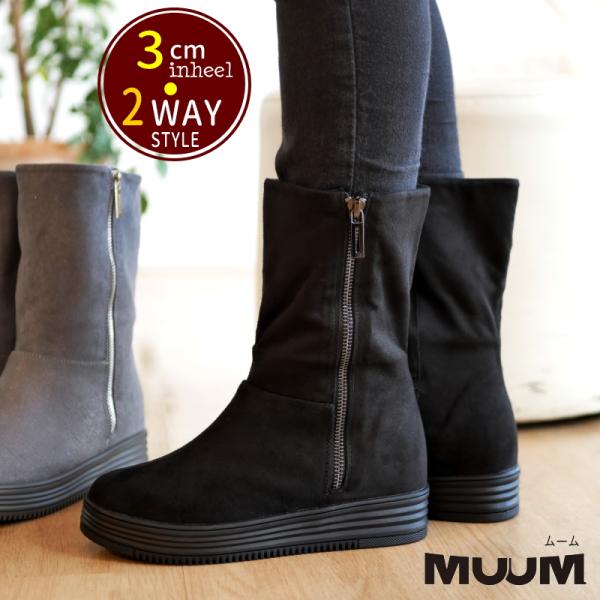ブーツ レディース 歩きやすい 厚底 ウェッジソール インヒール 歩きやすい MUUM ムーム ジップ ミドル丈 柔らかい 3E スエード あったかブーツ きれい目