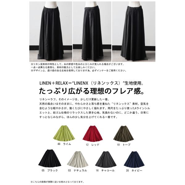 フレアスカート マキシ丈 ウエストゴム 麻混 ドレープ 無地