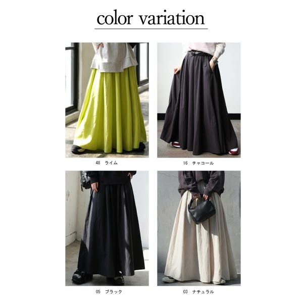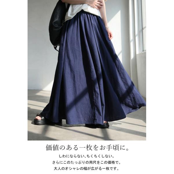 軽やかなリネン混素材を使用した春夏向けのロングスカートです。生地を贅沢に使ったAライン形状と足首までのマキシ丈が自然なドレープを生み、ウエスト総ゴム仕様でゆったりとした穿き心地と体型カバーを叶えます。