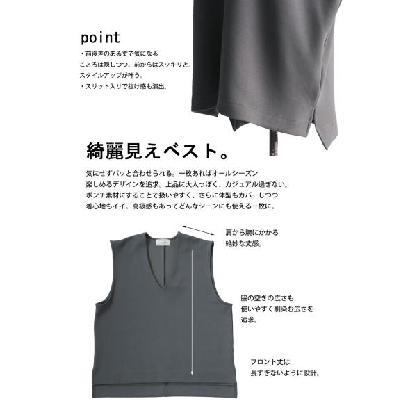 【検索ワード】ポンチベスト ベスト レディース トップス 無地 ゆったり きれいめ ポンチ素材 Vネック シンプル ノースリーブ プルオーバー 伸縮 もっちり ストレッチ レーヨン混 長め丈 前後差 スリット 重ね着 レイヤード 上品 見返し襟 とろみ 落ち感 オーバーサイズ ビッグシルエット 大きいサイズ antiqua アンティカ 大人 おしゃれ 10代 20代 30代 40代 50代 60代 春 夏 秋 冬 オールシーズン お洒落 カジュアル かわいい かっこいい あんてぃか