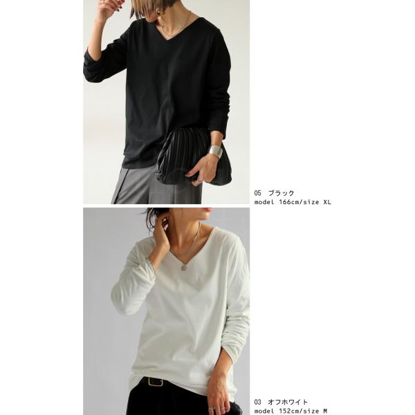 透けにくい二重仕立てのVネックロンT。ネックラインは美しいV字で顔まわりをシャープに見せ、長袖・無地のシンプルなデザインが着回し力を発揮。綿100%のコンパクトスムース素材で上品な光沢感と快適な着心地を兼ね備え、通勤からデイリーまで幅広く活躍する大人のための上質カットソー。