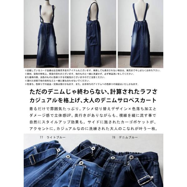 ヴィンテージ感あるデニム素材を使用したサロペットスカートは、Aラインのワイドシルエットとロング丈で体型カバーを叶えつつ、肩紐調整と後ろスリットで快適な着心地と動きやすさを両立した大人カジュアルな一着です。