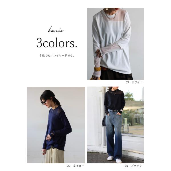 シアー素材と綿混生地を切り替えたレディース長袖トップスで、クルーネックと程よいゆったりシルエットが体型をカバーし、レイヤードにも一枚着にも対応する着回し力の高い一着です。