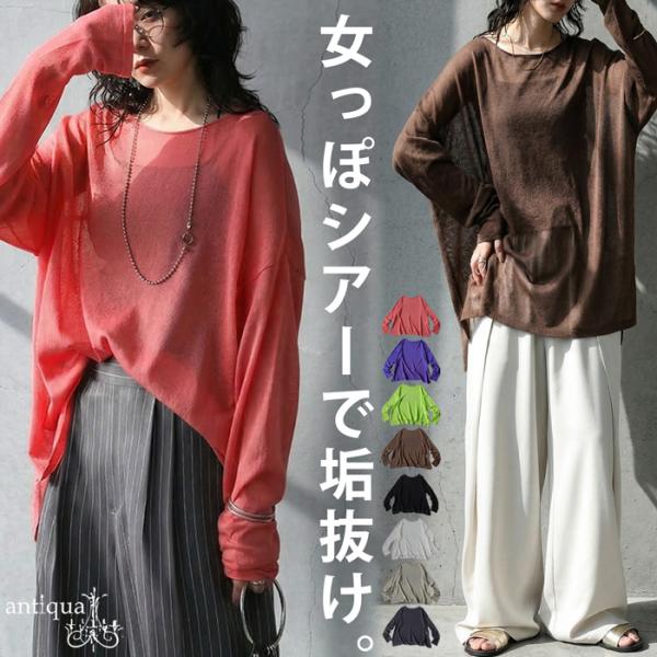 シアー ロンT レディース 長袖 ニット クルーネック 無地・50ptメール便可