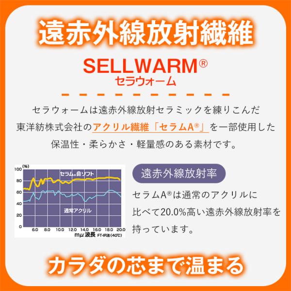 セラウォームは遠赤外線放射セラミックを練りこんだ東洋紡株式会社のアクリル繊維「セラムA」を一部使用した保温性・柔らかさ・軽量感のある素材です。