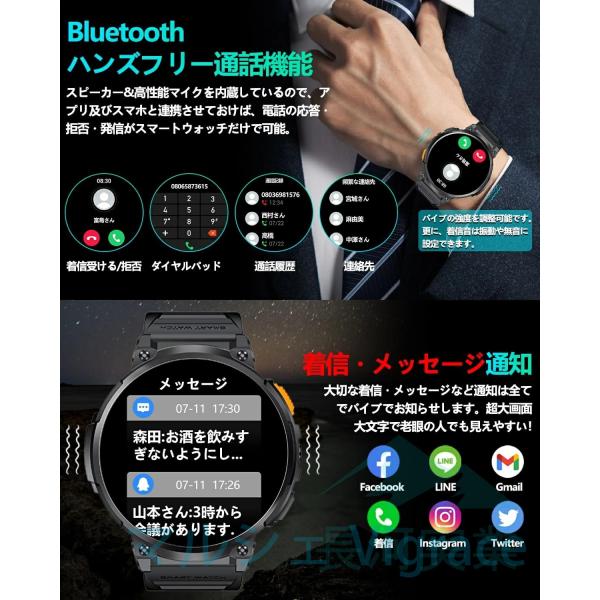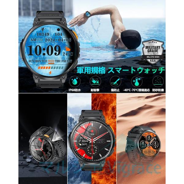 【2025年業界初1.85インチ丸型超大画面スマートウォッチ&軍用規格】 このスマートウォッチは1.85インチ超大画面のカラースクリーンが搭載され、視認性に優れた360*360高解像度で画質がより鮮明になり、より高精度な大画面で通知や文字が一目瞭然に表示されます。画面に大文字が表示され、老眼の人でも見えやすい。例のない快適な視覚感と優れた操作感をもたらします。画面の明るさ調節も可能で、強い日差し下にも視認性が高く、見やすいです。上下左右のスライド操作で機能の切替も簡単です。高透過率、耐衝撃、キズ防止があるHDパンダガラスと強度と硬度のあるシームレスフル亜鉛合金製フレームの組み合わせにより、上品ながらも頑丈な設計を実現しています。見た目と
