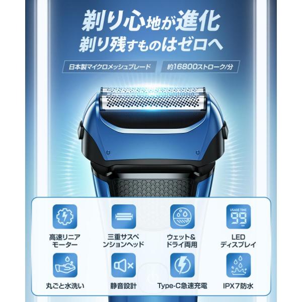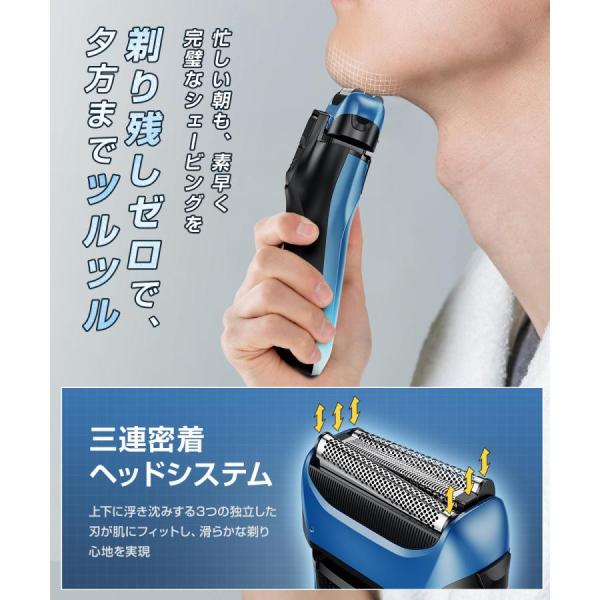 メンズシェーバー 電動 充電式 電気シェーバー 日本製刃 トリマー付き 髭剃り 3連密着ブレード 静音 LED表示 IPX7防水 洗い可能 軽量