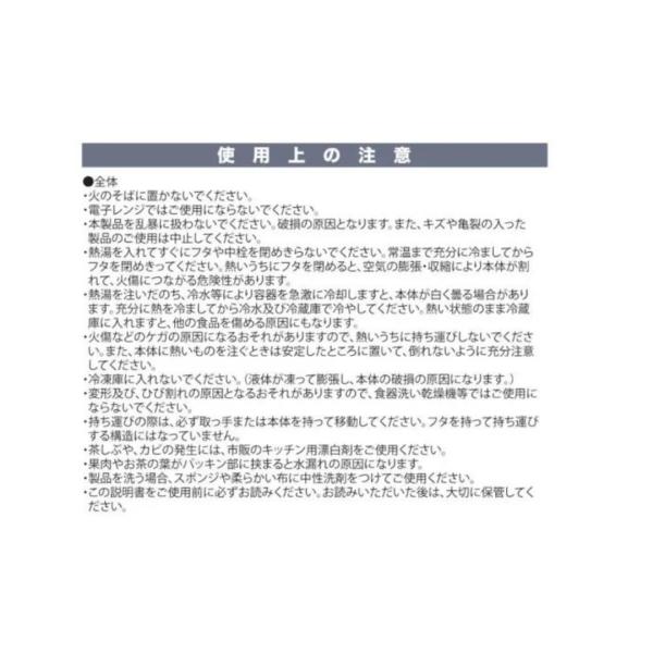 ◆熱湯を入れてすぐにフタを閉めきらないでください。常温まで充分に冷ましてからフタを閉めきってください。