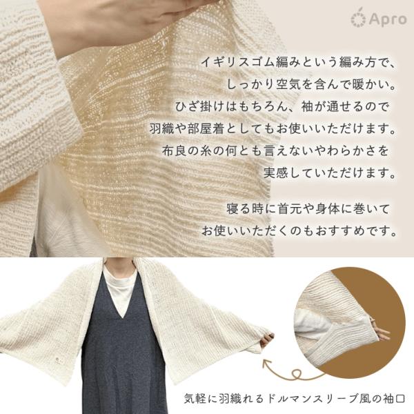 イギリスゴム編みという編み方で、しっかり空気を含んで暖かく、ひざ掛けはもちろん、袖が通せるので羽織としても部屋着としてもお使いいただけます。