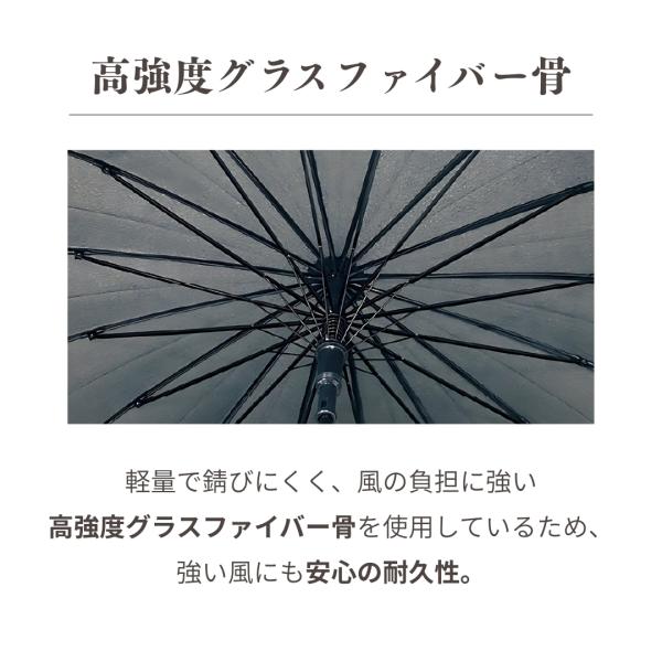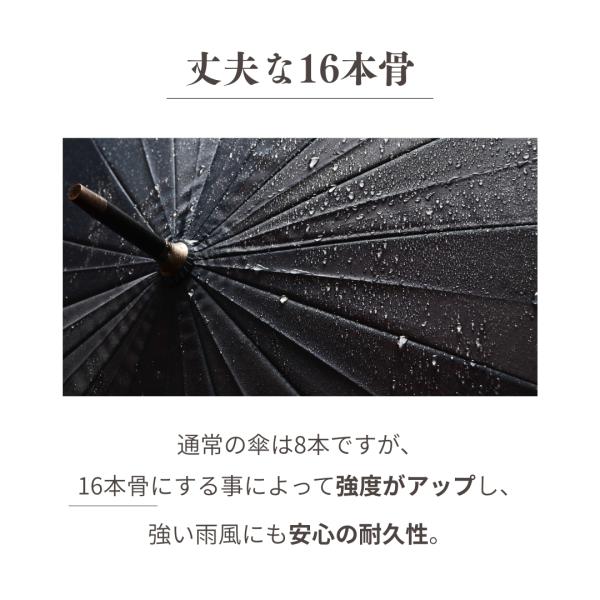 通常の傘は8本ですが、16本骨にすることによって強度がアップし、強い雨風にも安心の耐久性