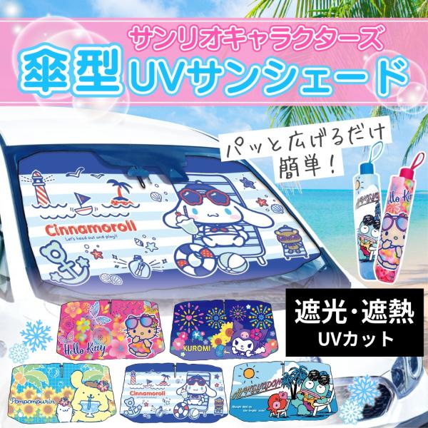 キャラクター サンリオ サンシェード 傘型 車用 S M 2サイズ フロント 窓 折りたたみ式 日よけ 遮光 断熱 簡単操作 収納ポーチ付き 折り畳み式 フロントカバー