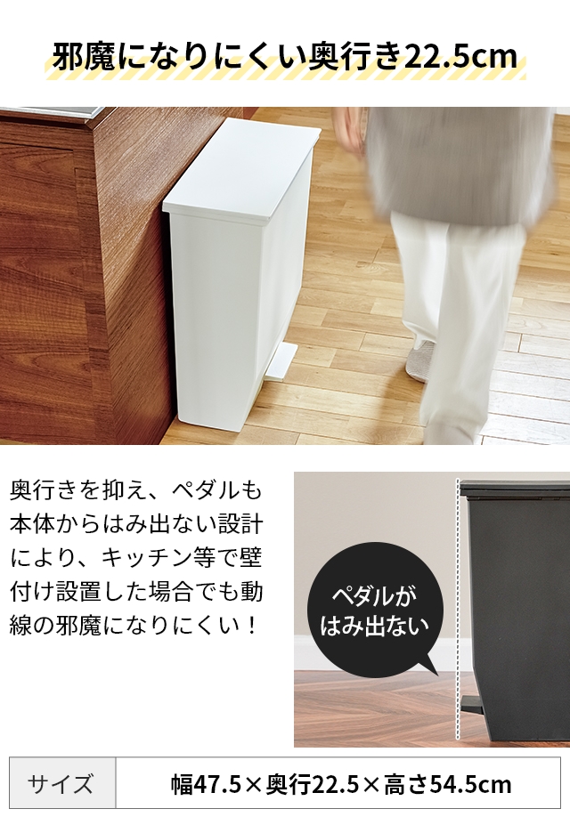 45Lと大容量なのに奥行き22.5cmのスリム設計でキッチンに設置しやすいゴミ箱。最大2分別まで可能、ペダル式でフタの開閉もラク。抗菌加工、防汚加工済で衛生面も安心です。