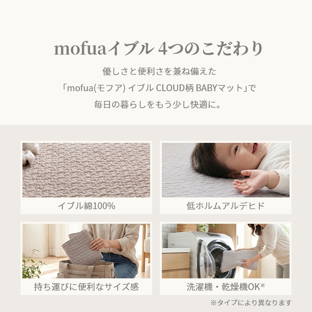 mofua(モフア) イブル CLOUD柄 綿100% BABYマット 4層防水仕様 45×70cmは、赤ちゃんの快適さと、ママ・パパの「汚したくない」を同時に叶えます 。肌に触れる表地は綿100%にこだわり、中層に防水機能を備えた4層構造を採用しました 。人気のクラウド柄キルトがお部屋を優しく彩り、汚れても洗濯機で丸洗いできるので毎日清潔にお使いいただけます 。