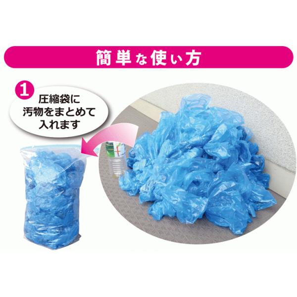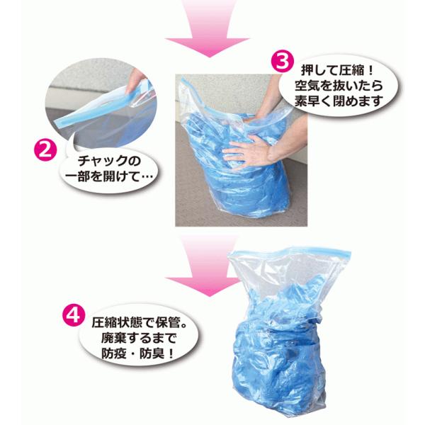 災害時や緊急時など、廃棄出来るまで時間がかかる悪臭ゴミ(生ゴミや簡易トイレなど)を密封&圧縮することで防疫・防臭・省スペースの効果が期待出来る防災用の圧縮袋です。