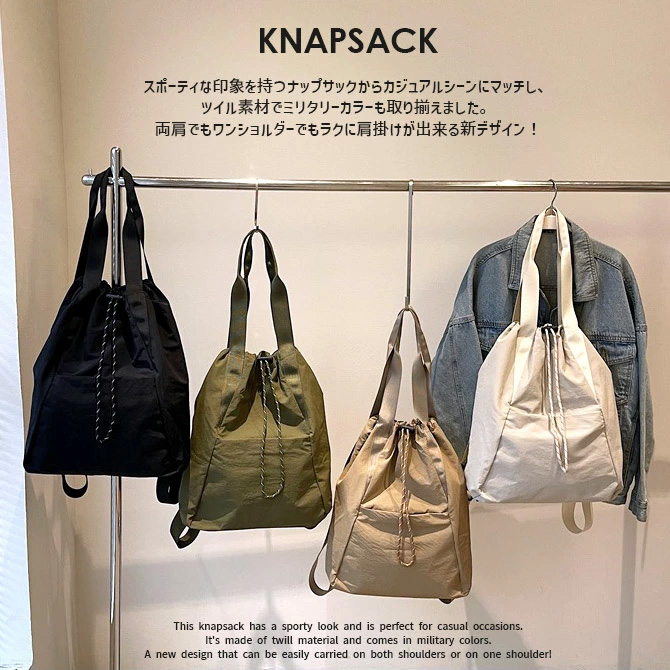 ナップサックは、ツイル素材を使用し、日常の様々なシーンや