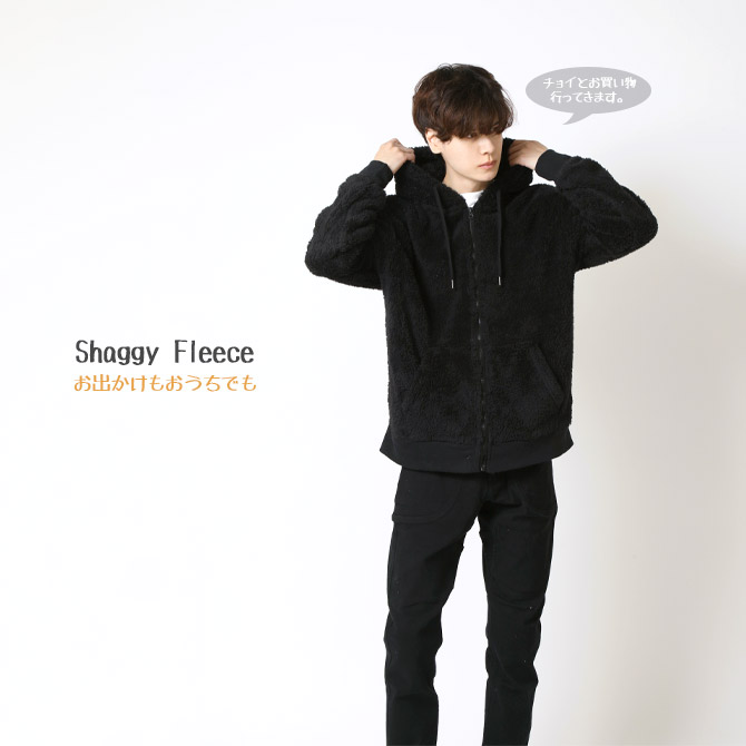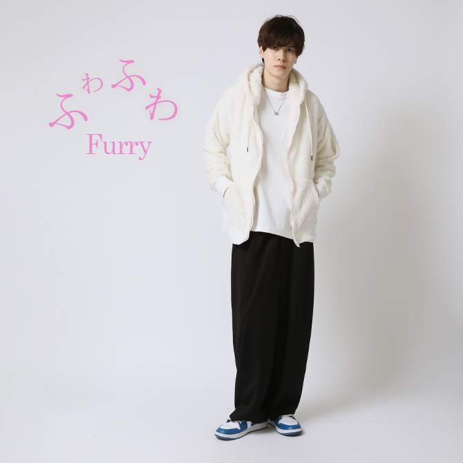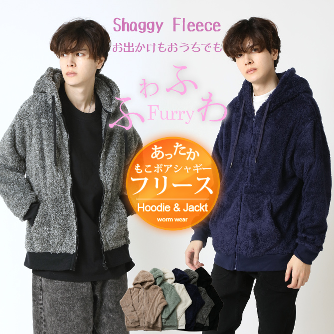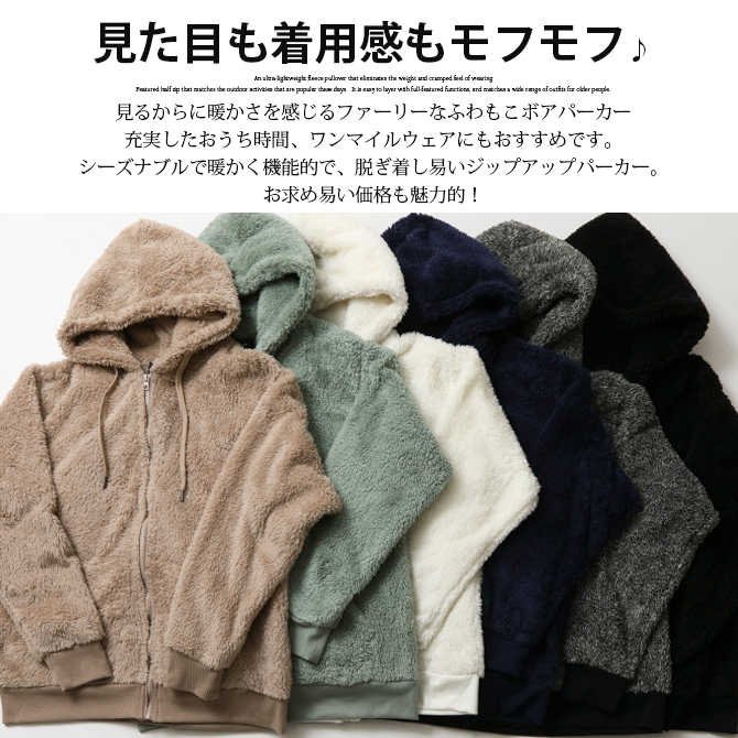 優しい肌触りのふわふわ もこもこシャギーボア素材を使用し保温性が高く、 軽くて暖かいプルパーカーの登場。