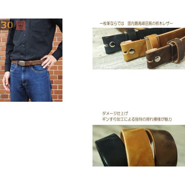バックルなし ベルト メンズ 本革 30mm 幅 帯のみ ダメージ仕上げ ギンすり(ブラック・チョコ・ブラウン) 一枚革 栃木レザー 牛革 日本製