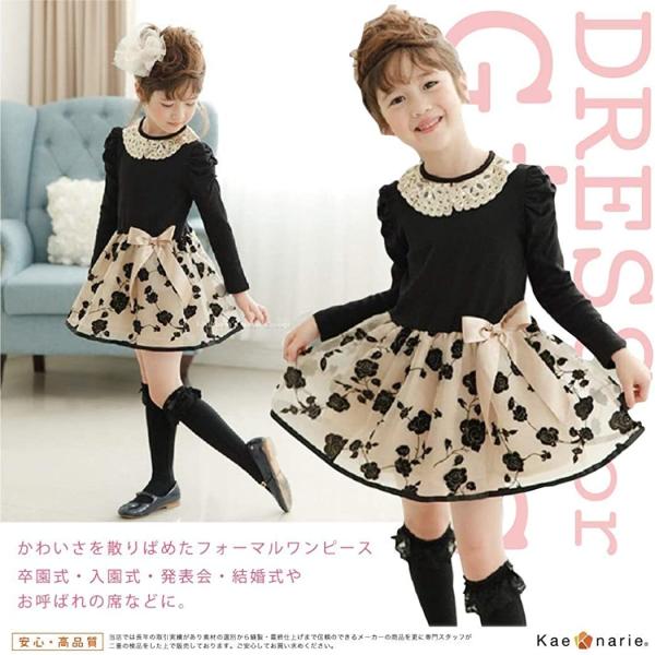 ガールズ フォーマル ワンピース ブラック ゴールド 花柄 シフォンスカート 襟 フリル リボン スカート 100〜160サイズ